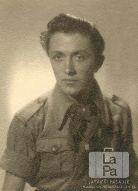 Skauta Valda Pavloviča portrets. Viņš dzīvoja Haunštetenes nometnē Augsburgā (amerikāņu zonā). Jaunietis formastērpā un ieveidotiem matiem.