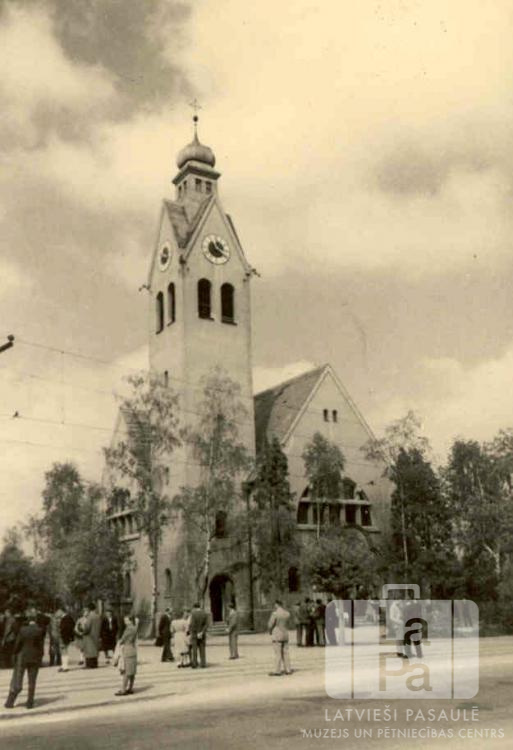 Ļaudis stāv laukumā pie luterāņu baznīcas Augsburgā (amerikāņu zonā) 1947. gada vasarā. Šajā dievnamā notika iesvētības latviešu jauniešiem no Haunštetenes nometnes Augsburgā. Uz ēkas torņa fasādes ir pulksteņi. Ap ēku aug koki.