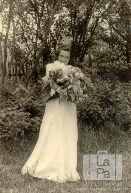 Valda Ērglis (pr. Burvikovs) stāv gaišā kleitā ar ziediem rokās savās iesvētībās Haunštetenes nometnē Augsburgā (amerikāņu zonā) 1947. gada vasarā. Viņa bija viena no piecpadsmit iesvētītajiem jauniešiem iesvētībās. Fonā ir koki.