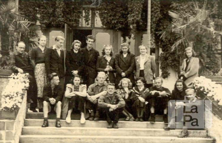 Audzinātāju grupa uz ēkas kāpnēm Augsburgā (amerikāņu zonā) 1948. gada vasarā gatavojas bērnu nometnei. Jaunieši divās rindās. Uz margām abpus kāpnēm ir ziedošas puķes podos. Margu augšgalā ir divas palmas. Fonā ēka ir apaugusi ar vīteņaugiem. Pirmajā rindā, pirmā no labās: Valda Ērglis (pr. Burvikovs). Otrajā rindā stāv, no kreisās: ceturtā Irēna Ērglis un sestā Alīse Ērglis. Par šo gadījumu Valda Burvikovs (dz. Ērglis) stāsta: "Lai darbotos YMCAs bērnu nometnēs, tika noturēti audzinātāju sagatavošanas kursi."