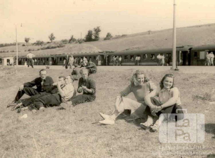 Divas draudzenes no Augsburgas (amerikāņu zonā) 1948. gada vasarā atpūšas, gaidot vilcienu pļavā pie dzelzceļa stacijas. Abas jaunietes sēž priekšplānā labajā pusē. Aiz viņām kreisajā pusē sēž četru jaunekļu grupa. Fonā ir stacijas perons ar vilcienu un pasažieriem. Priekšā, no labās: Valda Ērglis (pr. Burvikovs) un Biruta Kalēja (pr. Abuls).
