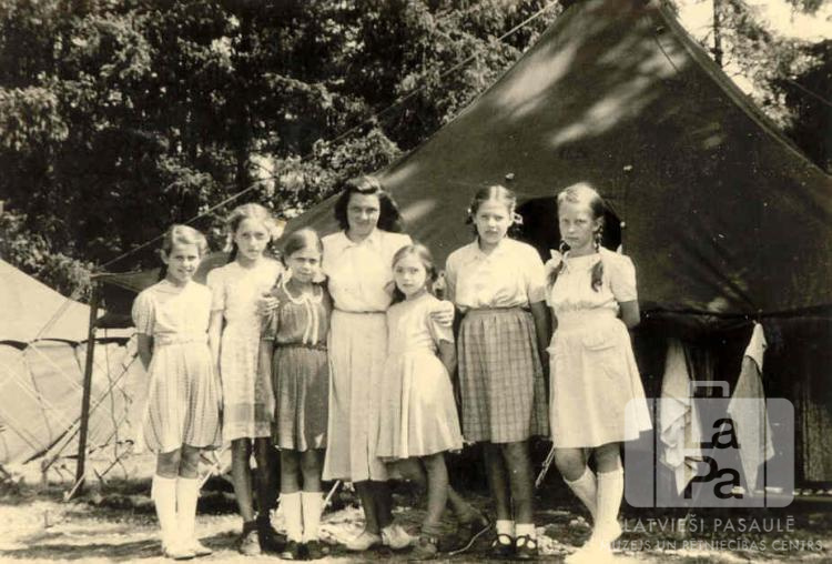 Audzinātāja no Haunštetenes nometnes Augsburgā 1949. gada vasarā stāv ar latviešu meitenēm organizācijas "YMCA" bērnu nometnē netālu no Augsburgas (amerikāņu zonā). Jauniete kopā ar sešām meitenēm gaišās kleitās. Fonā ir teltis un mežs. Ceturtā no kreisās: Valda Ērglis (pr. Burvikovs).