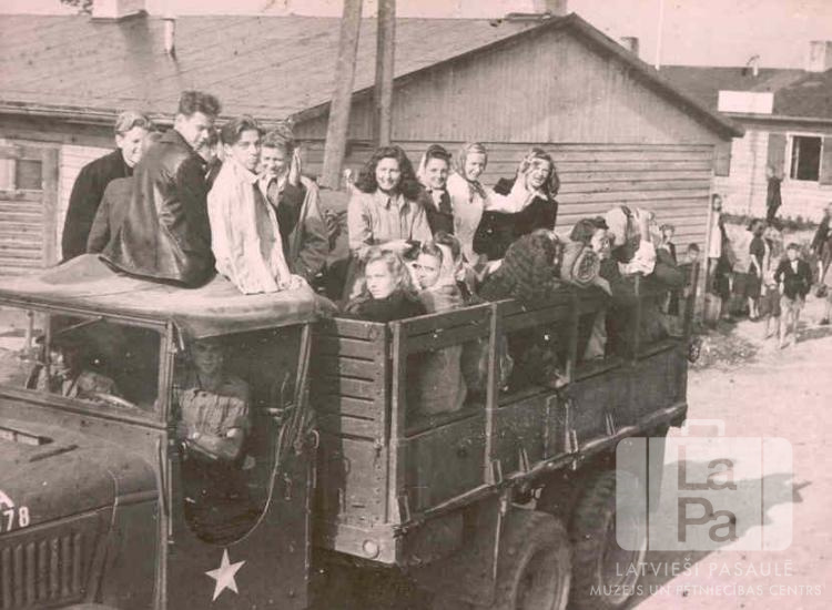 Jaunieši atstāj Haunštetenes nometni Augsburgā (amerikāņu zonā) ASV armijas kravas automašīnā 1948. gada rudenī. Jaunieši atrodas automašīnas kravas nodalījumā, uz automašīnas priekšējām durvīm ir redzama zvaigzne. Fonā ir cilvēki pie vienstāvu koka barakām.