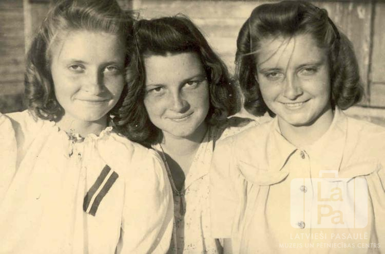 Trīs Ērgļu ģimenes māsas sporta svētkos Haunštetenes nometnē Augsburgā (amerikāņu zonā). Jaunās sportistes ir ģērbušās sporta tērpos. Vienai jaunietei pie apģērba ir piestiprināta Latvijas karoga lente. No kreisās: Irēna Ērglis, Valda Ērglis (pr. Burvikovs) un Alīse Ērglis.