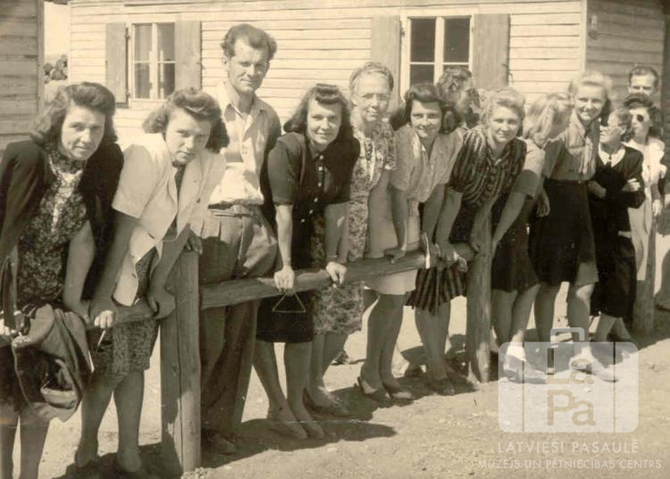 Nometnes iedzīvotāji skatās sporta svētku sacensības Haunštetenes nometnē Augsburgā (amerikāņu zonā). Cilvēki stāv rindā, atbalstījušies pret zemu koka žogu. Fonā ir koka ēkas. Priekšā, no kreisās: pirmā Rudzītis kundze, otrā Inta Rudzīte, trešais Hugo Krieķis, ceturtā Krieķis kundze, piektā Liepiņa kundze, sestā Valda Ērglis (pr. Burvikovs) un septītā Biruta Ērglis.