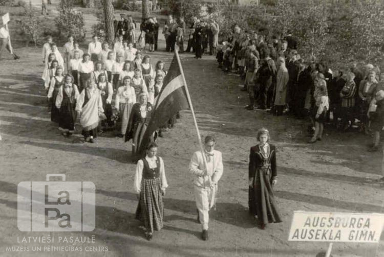 Ausekļa ģimnāzijas koris no Hohfeldes nometnes Augsburgā dodas Ausburgas dziesmu dienu parādē (amerikāņu zonā). Priekšā soļo Latvijas karoga nesējs ar divām tautumeitām; aiz viņiem soļo koris tautastērpos. Priekšplānā labajā pusē ir redzama koka zīme "AUGSBURGA / AUSEKĻA ĢIMN.". Labajā pusē stāv skatītāji. Skats no augšas.