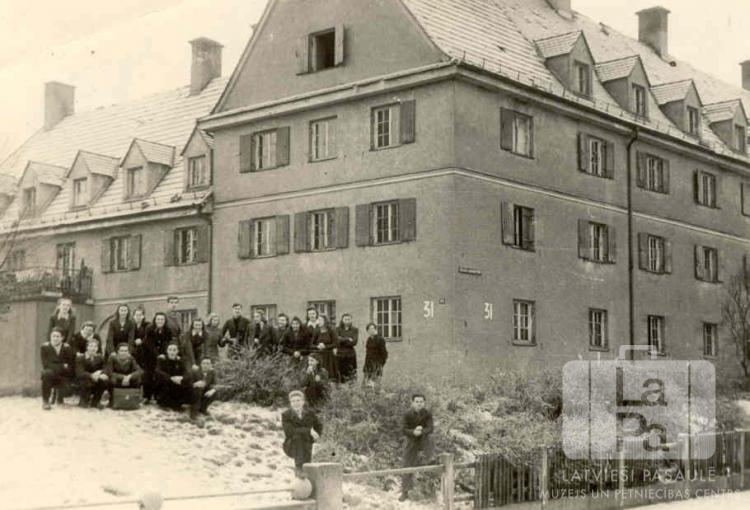 Cilvēku grupa ziemas laikā pie Ausekļa ģimnāzijas trīsstāvu mūra ēkas Hohfeldes nometnē Augsburgā (amerikāņu zonā). Zemi klāj sniegs. Priekšā stāv divi jaunekļi, ar kāju atbalstījušies pret žogu.