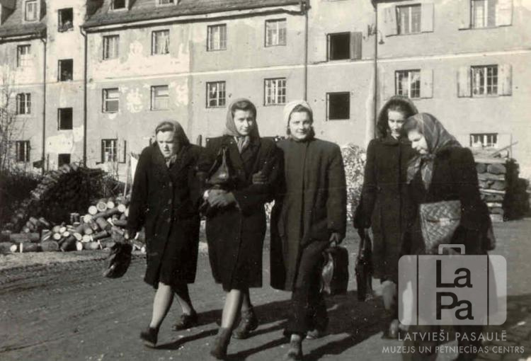 Piecas 3. klases ģimnāzistes dodas uz mācībām Ausekļa ģimnāzijā Hohfeldes nometnē Augsburgā (amerikāņu zonā). Jaunās sievietes ir ģērbušās mēteļos, ar lakatiem galvās; visām rokās ir dokumentu portfeļi. Fonā ir malkas kaudze un trīsstāvu mūra dzīvojamā ēka. No kreisās: Zenta Reineka, trešā Renāte Pavloviča, ceturtā Valda Ērglis (pr. Burvikovs).