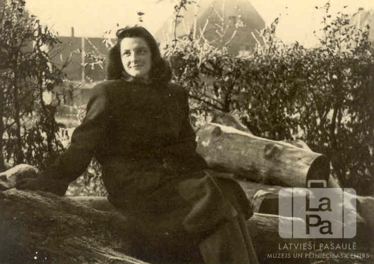 Ausekļa ģimnāzijas Hohfeldes nometnē Augsburgā (amerikāņu zonā) audzēkne Valda Ērglis (pr. Burvikovs) tumšā mētelī sēž uz zāģētiem baļķiem. Fonā aiz dzīvžoga ir vairākas ēkas.