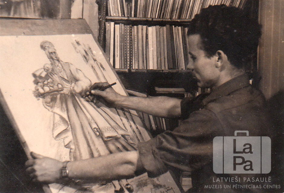 Jānis Laduzāns glezno tautu meitu Emdenē (angļu zonā). Fonā ir grāmatu plaukti. Par šo gadījumu Valda Sankalis (dz. Lipiņa) stāsta: "Jānis bija mana brāļa draugs, un viņam loti patika gleznot. Viņš no Vācijas izceļoja uz Austrāliju."