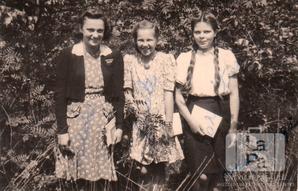 Trīs smaidīgas skolnieces, absolvējot 5. klasi Rotenburgas nometnē (Vimmē, angļu zonā). Jaunietes rokās tur dokumentus. Fonā ir mežs. No kreisās: Valda Lipiņa (pr. Sankalis), Beāte Nesaule un Margita Fišere. Uz fotogrāfijas ar zilu krāsu rokrakstā ir rakstīti, iespējams, tajā redzamo meiteņu vārdi.