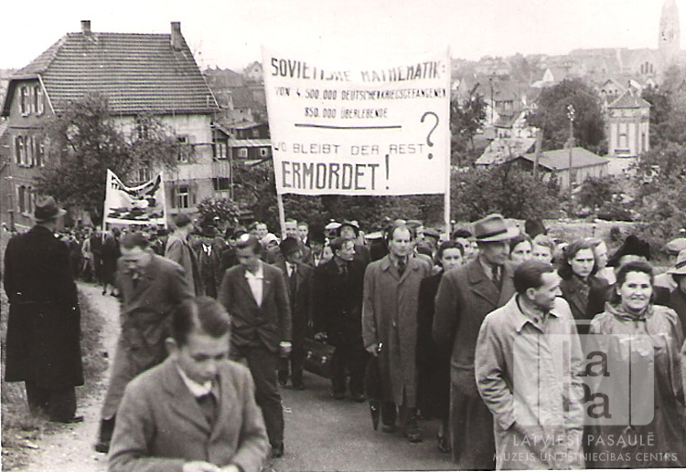 Liela demonstrantu grupa ar plakātiem dodas garā gājienā augšup pa ielu Eslingenē (amerikāņu zonā). Cilvēki ir ģērbušies mēteļos un tautastērpos. Uz plakātiem ir dažādi uzraksti, piemēram, "WO BLEIBT DER REST? / ERMORDET!". Fonā ir skats uz pilsētas ēkām. Māris Roberts Zemmers raksta: "Lai gan nevaru 100% apgalvot, domāju ka tā bija sekojoša. Latvieši taisīja lielu demonstrāciju pret UNRRAs izdarību, atvedot komunistu vīrus, droši vien čekistus (NKVD), kuri mēģināja pierunāt latviešus atgriesties Latvijā. Viņi solīja daudz ko, un daži reti viņiem noticēja. Saprotams, tie tika vai nu nošauti jeb aizsūtīti uz gulagu. Es kopā ar citiem Eslingenas Pamatskolas studentiem noskatījos, kā krievi brauc tieši garām skolai atklātā automobīlī. Mēs turējām rokās tintes pudelītes un plānojām tās uzmest komunistiem. Tomēr atturējāmies, jo zinājām, ka mums būs problēmas ar klases audzinātāju Smita jkdzi, skolas inspektoru Azaci un direktoru Vinteri."