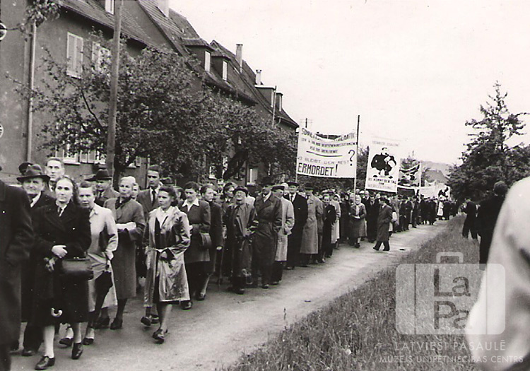 Liela demonstrantu grupa ar plakātiem dodas garā gājienā pa ielu Eslingenē (amerikāņu zonā). Cilvēki ir ģērbušies mēteļos. Uz plakātiem ir dažādi uzraksti, piemēram, "ERMORDET!". Kreisajā pusē aiz gājējiem ielas malā ir koku rinda un divstāvu mūra ēkas, bet labajā gājiena pusē zālē stāv skatītāji.