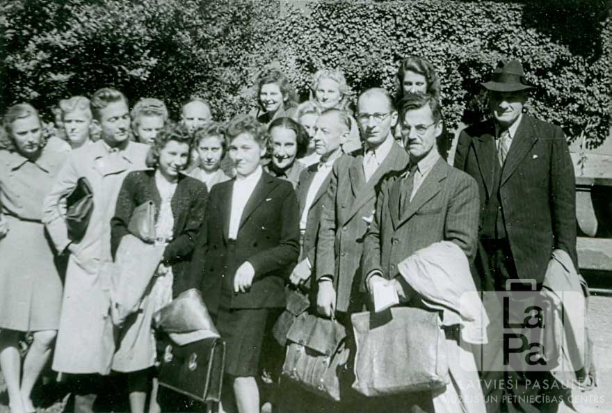 Fotogrāfijas dāvinātāja rakstītais atmiņu stāsts par bēgļu gaitām un bēgļu nometnēm: "Rīgu atstājām 1944. gada 18. augustā – fronte tuvojās Rīgai, bija jau noticis padomju armijas uzbrukums Jelgavai, krievu tanku smailes bija jau aizsteigušās līdz pat Tukumam – bija skaidrs, ka stāvoklis ir kļuvis gaužām kritisks. Pati biju tikko beigusi ģimnāziju, bet nu likās, ka tālākie nodomi rudenī iestāties universitātē būs jāatliek uz nenoteiktu laiku. Mana māte Marta Līne strādāja par grāmatvedi Valsts Dzelzceļu virsvaldē, kas, protams, bija tagad padota vācu okupācijas iestādēm. Augusta sākumā darbiniekiem paziņoja, ka Virsvaldi evakuēs uz Vāciju – darbinieki līdz ar ģimenēm varēja paturēt līdzšinējo darbu, dodoties līdz uz Vāciju. Nu sekoja grūtas izšķiršanās dienas – palikt – jeb doties svešumā, nezinot, ko nesīs nākotne… Manai ģimenei gan bija skaidrs, ka otrreiz zem krievu varas nepaliksim! Lai ar jaunākais brālis bija iesaukts gaisa izpalīgos un dienēja Kurzemē. Tā nu posāmies ceļam – labā cerībā, ka kaŗš drīz beigsies un tiksim atkal mājās. Bija noteikts sapulcēties Doma laukumā jau plkst. 6-0s no rīta, pēc tam visa dzelceļu Virsvaldes grupa devāmies uz Daugavmalu, kur Pils priekšā jau gaidīja vācu transporta kuģis, vārdu tam gan vairs neatceros. Vispirms kuģis uzņēma ievainotos karavīrus – šis process vilkās gandrīz visu dienu – un mēs tikām kuģī tikai vēlā pēcpusdienā – nokarsuši, izslāpuši, noguruši no ilgās gaidīšanas karstajā augusta saulē. Pēc 2 dienu brauciena kuģis nonāca Dancigā/Gottenhafenas ostā, kur atkal sākas tas pats bezgala garais, šoreiz izkāpšanas process. Pirmo nakti pārlaidām turpat ostmalā zem klajas debess – pēc tam mūs nosūtīja uz tādu kā “uztveršanas nometni”, kur izsniedza pārtikas kartītes un personu apliecības, izgājām cauri arī “Entlausung“ atutošanas procedūrai un pēc pāris dienām nonācām Altdammā – Štetīnas pievārtē. Gaidījām, kad mūs norīkos darbā – bet dīvainā kārtā tas nenotika… Dzelzceļu Virsvalde likās, it kā būtu pazudusi… Likās, ka esam atstāti savam liktenim. Nometnes barakas tomēr bija tīras, diezgan jaunas, varējām brīvi staigāt pa pilsētiņu, laiks pieturējās saulains un silts, bet visus, protams, nomāca rūpes par mājām un Latviju. Tā samērā bezrūpīgi nodzīvojām līdz novembra vidum, kad saņēmām rīkojumu doties uz Cvikavu (Zwickau) Saksijā, netālu no Drēzdenes, kur mūs gaidīja darbs dzelzceļu darbnīcās. Tā bija paliela pilsēta, diezgan svarīgs dzelzceļu mezgls – te dabūjām izbaudīt arī pirmās nopietnās uzlidojumu briesmas. Šai sakarībā atceros, ka patvertnes bija šķirotas – vāciešiem tās bija labi izbūvētos pagrabos, Rietumeiropas strādniekiem – tādās kā zemnīcās, nostiprinātas ar smilšu maisiem, bet poļu un krievu strādniekus, arī gūstekņus, izdzina vienkārši klajā laukā nogaidīt uzlidojuma beigas. Amerikāņu karaspēks Cvikavu ieņēma 1945. gada aprīļa beigās – tur arī sagaidījām kaŗa beigas – bezgala atviegloti, ka esam izbēguši no krievu nagiem. Bet mūsu prieki bija īsi – nezinājām jau neko par okupācijas Zonām un Sabiedroto savstarpējiem darījumiem. Kad par to uzzinājām – ar steigu savācām visas vēl atlikušas mantas un nolēmām doties tālāk uz rietumiem. Šoreiz mūs neviens nekur neveda, transports bija jāgādā pašiem, kas nebūt nebija viegli izdarāms! Satiksmes vilcieni negāja… kaut kā tomēr bija jātiek līdz Bavārijas robežai, tad būtu drošībā. Bijām atkal salasījušies grupā kādi 10 cilvēki – nu jau vairs nebija nekā no oriģinālās Dzelzceļu Virsvaldes cilvēkiem, tomēr arī šiem visiem bija viens mērķis – pēc iespējas tālāk no krieviem! Laimīgā kārtā bijām atraduši kādu vācu šoferi, kas par neiedomājami lielu samaksu mūs aizveda līdz Bambergai – pirmā pilsētiņa Bavārijā. No turienes pēc vairāku dienu gaidīšanas ar vairākiem preču vilcieniem tikām līdz Vircburgai, kur dažiem no mums bija pazīstamas vācu ģimenes – tur cerējām atrast ja ne pajumti, tad vismaz kādu padomu, kur piemesties. Vircburgas stacija bija uzlidojumos totāli izpostīta – taču skats, kas mums atklājās stacijas laukumā, lika aizrauties elpai – cik tālu vien skats sniedzās – bija viens vienīgs drupu un gruvešu lauks! Bija jauks jūnija rīts – bet visur vēdīja savāda pretīgi saldena smaka. Nebija ko domāt šai postījumu laukā atrast kādu pazīstamu cilvēku – bija skaidrs, ka šos uzlidojumus nav pārdzīvojis neviens un ka tūkstošiem cilvēku guļ zem drupām māju pagrabos. Atkal sēdējām stacijas laukumā gandrīz vai bez padoma – taču kādi no mums bija laikam no amerikāņu kaŗavīriem saklausījuši, ka apm. 5 km attālumā no pilsētas esot bēgļu nometne – tad nu devāmies uz turieni. Tā bija tā sauktā Ziemeļu nometne, kur mitinājās dažādas tautības bēgļi – un nu arī mēs. Pēc pāris mēnešiem daļu no šiem bēgļiem – latviešus – pārvietoja uz Centrālo nometni, arī mani un manu māmiņu. Centrālajā DP nometnē ieradāmies kaut kad 1945. gada augusta beigās – un tā tur pavadīju veselus 4 gadus līdz pat aizbraukšanai uz ASV. Liela daļa no Vircburgas Centrālās DP nometnes bija smagi cietusi Otrā Pasaules kaŗa kaujās. Daudzi iedzīvotāji ilgu laiku dzīvoja pussagrautās ēkās. Par nometni daudz rakstījuši jau citi, gribu te tikai mazliet pieminēt par studentu grupu, kas šajos 4 gados bija ne mazāk aktīva. Jau 1945. gada rudenī sākām interesēties par studiju iespējām. Vircburga bija slavena universitātes pilsēta – šeit bija darbojies W. K. Roentgens, arī Dr. Alzheimers, kuŗš pirmais aprakstījis bēdīgi slavenās mūsdienu slimības sindromu. Vircburgas Julius Maximiliana Univ