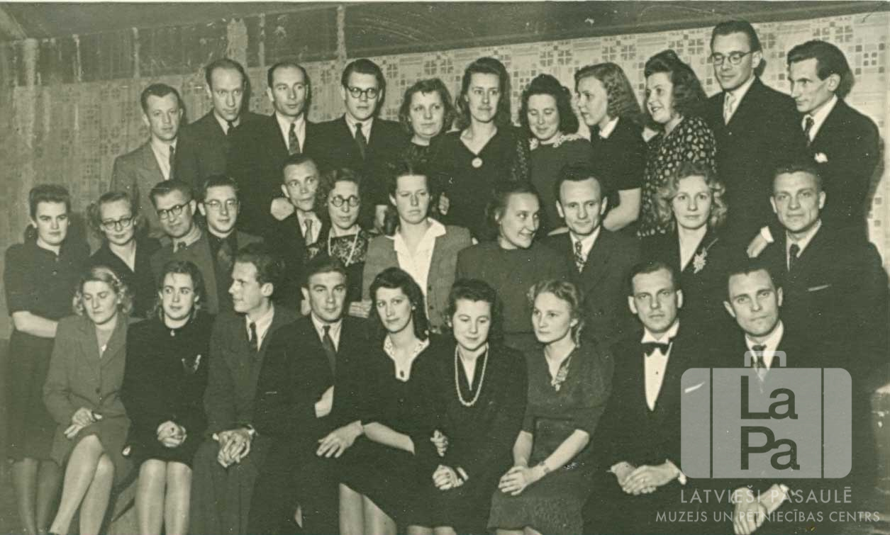 Studentu grupa Vircburgā (amerikāņu zonā) atvadās no pirmajām aizbraucējām uz Kanādu. Liela studentu grupa vairākās rindās. Fonā ir rakstaina telpas siena. Pirmajā rindā, no kreisās: pirmā S. Ozola, otrā Silvija Indrāne, ceturtais Jānis Platais un sestā Alma Remkima. Otrajā rindā, no kreisās: pirmā Valija Līne (pr. Skrodele), ceturtais Alfēds Puķīte un septītā Silvija Grīva. Trešajā rindā, no kreisās: otrais Visvaldis Bergs un vienpadsmitais Eižens Lizlovs.