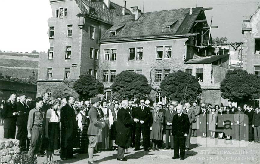Latvijas Republikas sūtnis Lielbritānijā Kārlis Zariņš apmeklē Centrālo nometni Vircburgā (amerikāņu zonā). Liela cilvēku grupa uzvalkos, mēteļos, formastērpos un tautastērpos stāv laukumā. Sūtni apsveic nometnes administrācija, skolēni, skauti, gaidas un iedzīvotāji. Aizmugurē ir redzamas kaŗa laikā sagrautas un salabotas nometnes vairākstāvu mūra dzīvojamās ēkas ar zemu, apaļu koku rindu priekšā. Fonā kreisajā pusē aiz ēkām ir redzama nogāze ar, iespējams, vīnogulājiem. Fotogrāfijas augšējais kreisais stūris ir noplēsts.