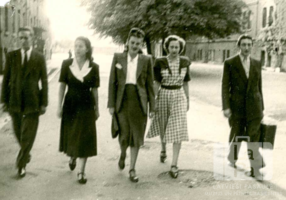 Piecu jaunu cilvēku grupa pastaigājas pa Centrālās nometnes galveno ielu Vircburgā (amerikāņu zonā), dodoties uz nometnes vārtiem. Vīrietis labajā pusē rokā nes koferi. Fonā ielas malā aug vairāki koki. Abās ielas pusēs ir vairākstāvu mūra dzīvojamās ēkas. Priekšā, no kreisās: Arturs Skrodelis, Irēne Puķīte (doktore), Valija Skrodele (dz. Līne), Ligita Bode un Juris Silenieks.