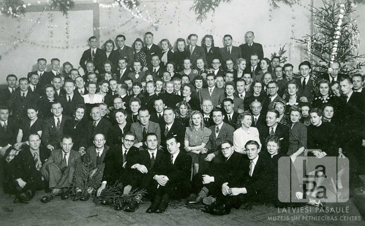 Studiju biedri kopā ar viesiem Vircburgas Latviešu studentu biedrības eglītes vakarā Vircburgā (amerikāņu zonā). Liela cilvēku grupa daudzās rindās iekštelpās. Telpa ir dekorēta ar rotājumu vērtenēm, egļu zariem, kā arī egli labajā telpas stūrī, aiz cilvēkiem.