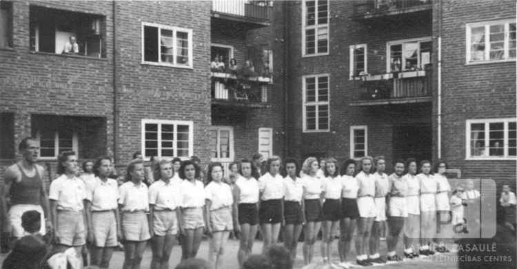 Sportistes Manheimes nometnes (angļu zonā) blokmāju pagalmā. Jaunietes stāv ierindā gaišos sporta tērpos, vidū stāv jaunietes tumšos šortos. Kreisajā ierindas galā stāv vīrietis. Priekšplānā un no ēkas balkoniem aizmugurē skatās skatītāji.