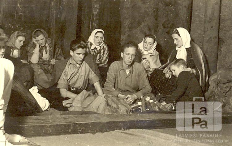 Aktieri tērpos sēž uz skatuves teātra uzvedumā "Zemgaliešu aiziešana" Manheimas nometnē (angļu zonā). To uzveda nometnes iedzīvotāju teātris. Visi aktieri sēž ar nodurtām galvām, sievietēm galvās ir lakati. Aktieru priekšā ir neaizdegts malkas ugunskurs.