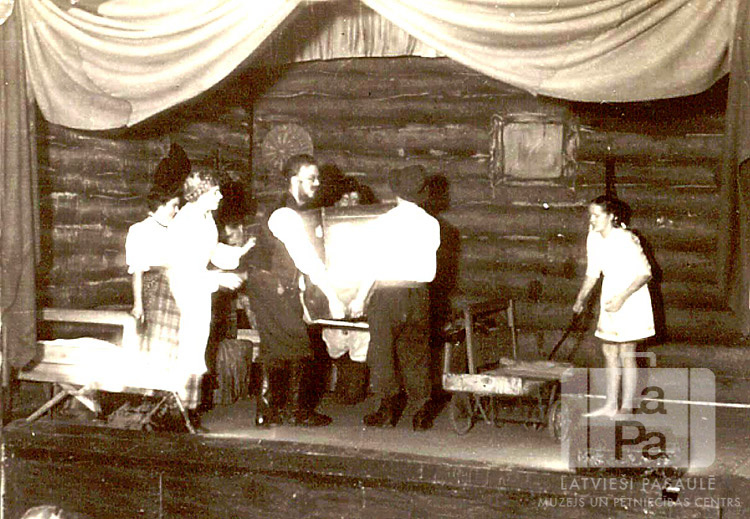 Aktieri gaišos tērpos uz skatuves teātra uzvedumā "Paradīzē" Manheimas nometnē (angļu zonā). Uzvedumu pēc R. Blaumaņa noveles dramatizējis K. Tumils-Tumilovičs. Divi aktieri vidū nes priekšmetu, pārējie stāv viņiem apkārt. Labajā pusē jauniete stāv pie ratiem (?). Skatuves sienas attēlo guļbaļķu mājas iekšpusi. Skatuves priekšā ir divi prožektori, kas to izgaismo.