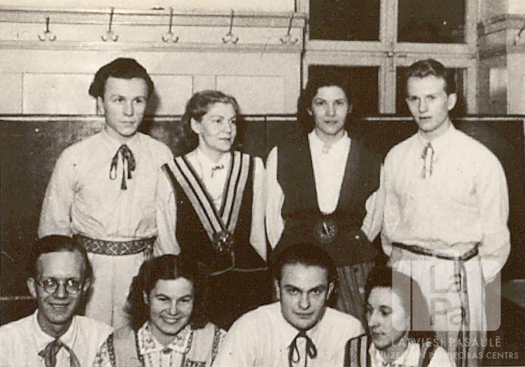 Tautas deju ansamblis Manheimas nometnē (angļu zonā). Astoņi jaunieši tautastērpos divās rindās. Fonā pie sienas ir pakarināmie un logs. Pirmajā rindā, no kreisās: Valters Zālīte, Gaida Zvejniece (pr. Risberga), Gunārs Sviķis un Irma Dombrovska (pr. Zālīte).