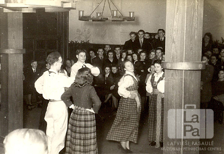 Manheimas nometnes (angļu zonā) tautas deju ansamblis sniedz priekšnesumu organizācijas "YMCA" sarīkojumā. Jaunieši tautastērpos dejo starp divām koka kolonnām. Fonā sēž skatītāji.