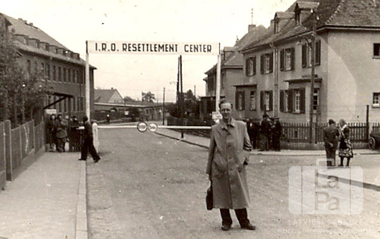Valters Zālīte garā mētelī stāv uz ielas Bucbahas izceļošanas nometnē (amerikāņu zonā). Fonā ir nometnes vārti ar uzrakstu "I.R.O. RESETTLEMENT CENTER" un divām nolaistām barjerām. Abpus vārtiem un citviet uz ielas stāv cilvēki. Ielas malās aiz žogiem ir vairākstāvu mūra ēkas.