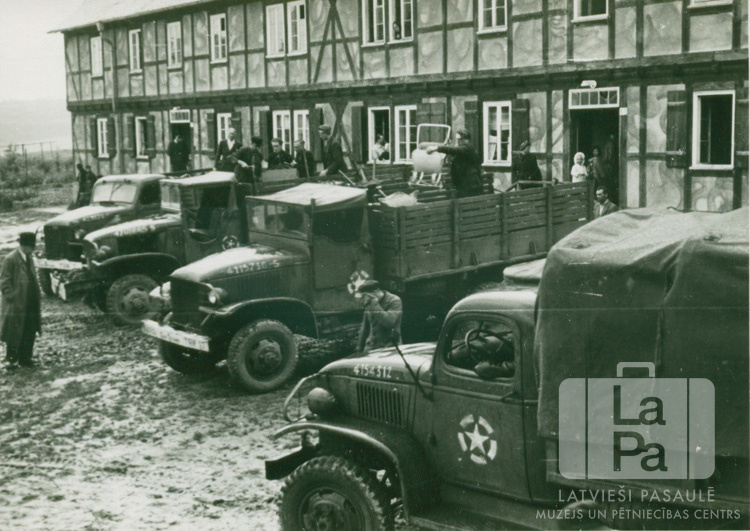 Allendorfas nometnes likvidēšana (amerikāņu zonā). Ļaudis no divstāvu dzīvojamās ēkas krāmē vaļējās kravas automašīnās dažādas mantas. Priekšplānā uz kravas automašīnas durvīm ir zvaigzne; tās kravas nodalījums ir pārklāts ar brezentu. Foto autors: P. Miezītis.