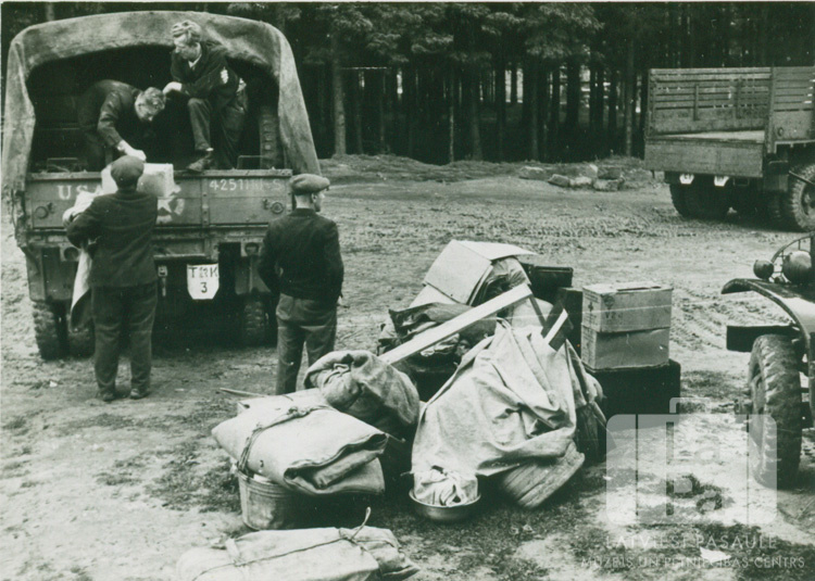 Pārcelšanās (jurģu) diena Allendorfas nometnē (amerikāņu zonā). Foto autors: P. Miezītis. Vīrieši krāmē ar brezentu pārklātas smagās automašīnas kravas nodalījumā dažādas mantas. Divi vīri stāv pie automašīnas, divi stāv automašīnā. Priekšplānā ir mantu kaudze ar mazu Latvijas karogu. Fonā ir citas smagās automašīnas un mežs.