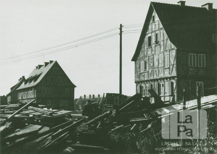 Skats, ļaudīm iebraucot Allendorfas nometnē (amerikāņu zonā) 1946. gada sākumā. Priekšplānā ir liela dēļu kaudze, fonā ir divas divstāvu dzīvojamās ēkas. Foto autors: P. Miezītis.