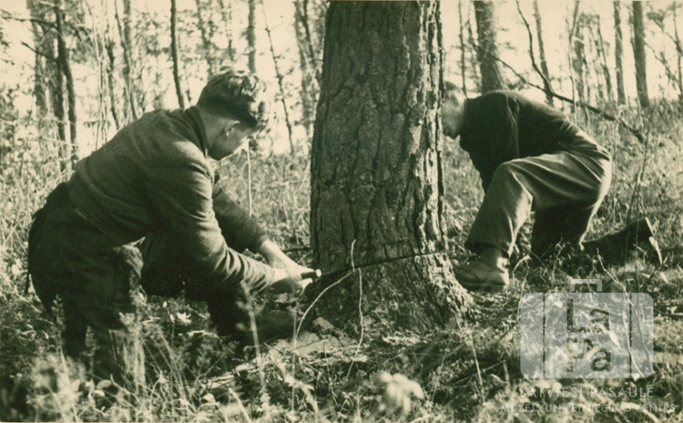 Divi vīri saulainā dienā ar divroci zāģi zāģē koku mežā pie Kaseles (amerikāņu zonā). Foto autors: P. Miezītis.