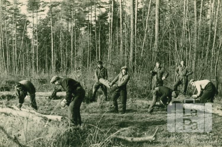 Vīri meža darbos pie Kaseles (amerikāņu zonā). Vīrieši zāģē, nes un mēra baļķus. Foto autors: P. Miezītis.