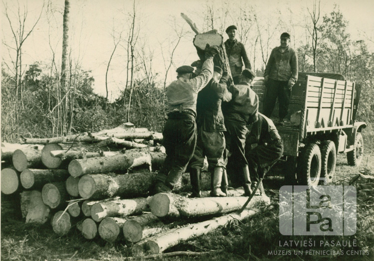 Latvieši krauj baļķus kravas automašīnā mežā pie Kaseles (amerikāņu zonā), veicot siltuma sagādes darbus ziemai. Foto autors: P. Miezītis.