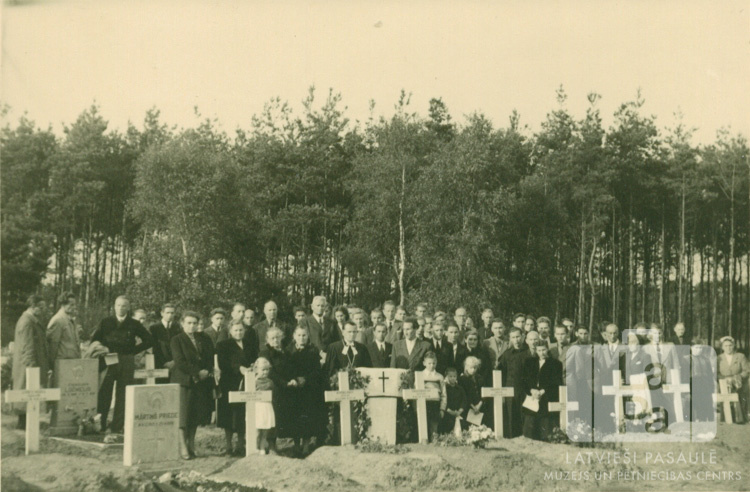 Piemiņas plākšņu iesvētīšana latviešu bijušajiem karavīriem Oldenburgas kapos (angļu zonā). Cilvēku grupa kapsētā ir sastājušies pie kapu krustiem. Fonā ir mežs. Grupas vidū ir redzams Ģenerālis Bangerskis.