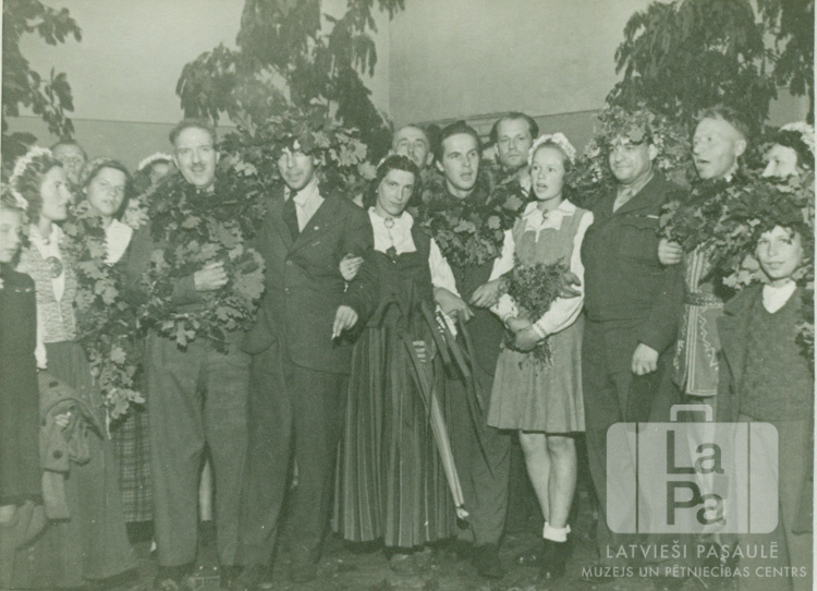 Cilvēki ar Jāņu vaiņagiem dzied Jāņu svētku vakarā Hānavas latviešu nometnē (amerikāņu zonā). Telpas stūrī stāv vīri uzvalkos un sievietes kleitās un tautastērpos.