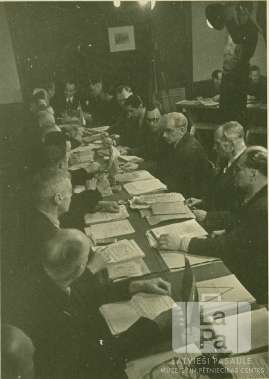 Latvijas Centrālās komitejas sesijas sēde Hānavā (amerikāņu zonā). Skats no augšas uz vīriem, kas sēž pie gara galda, kas ir nokrauts ar daudziem dokumentiem. Fonā stāv vīrietis, kas ar lampām apgaismo galdu. Galda kreisajā pusē ir redzami: Aleksandrs Kacēns, Eduards Grosbergs, Jānis Lavenieks un Alfrēds Valdmanis. Galda labajā pusē ir redzami: Fricis Gulbis, Kārlis Kundziņš, Arvēds Švābe, Jēkabs Poruks un Alfons Reine. Foto autors: E. Kraucs (filma).