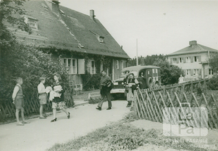Cilvēki dodas pa ielu garām ātrās palīdzības automašīnai Ausmas nometnē Kleinkecā (amerikāņu zonā). Automašīna ar krustu uz sāniem ir novietota pie augstas vienstāvu ēkas. Priekšplānā labajā pusē ir ar koka sētu iežogots dārzs. Fonā ir divstāvu mūra ēka. Foto autors: E. Kraucs (filma).