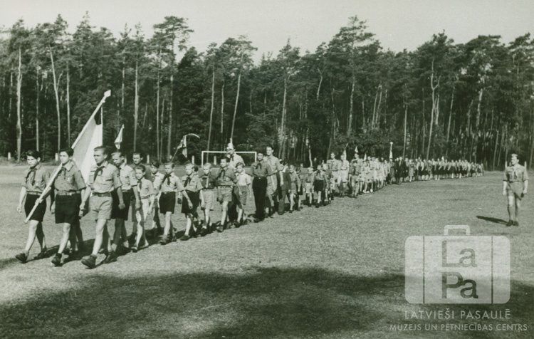 Skauti un gaidas dodas garā gājienā pāri laukumam Karlsrūē (amerikāņu zonā). Tika atzīmēta sēru diena, veltīta 1941. gada 14. jūnijā Padomju Savienības deportētajiem Latvijas iedzīvotājiem. Priekšā soļo karognesēji. Fonā ir mežs. Foto autors: P. Miezītis.