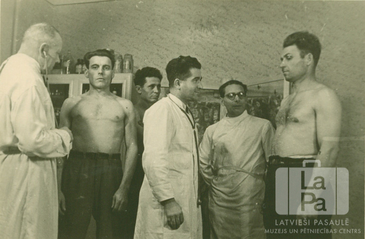 Trīs ārsti baltos halātos un divi vīri ar atkailinātu augšdaļu stāv kabinetā pārvietoto personu medicīniskajā pārbaudē (angļu zonā). Fonā pie sienas ir skapis ar stikla traukiem, kā arī aizslietnis. Foto autors: E. Kraucs (filma).