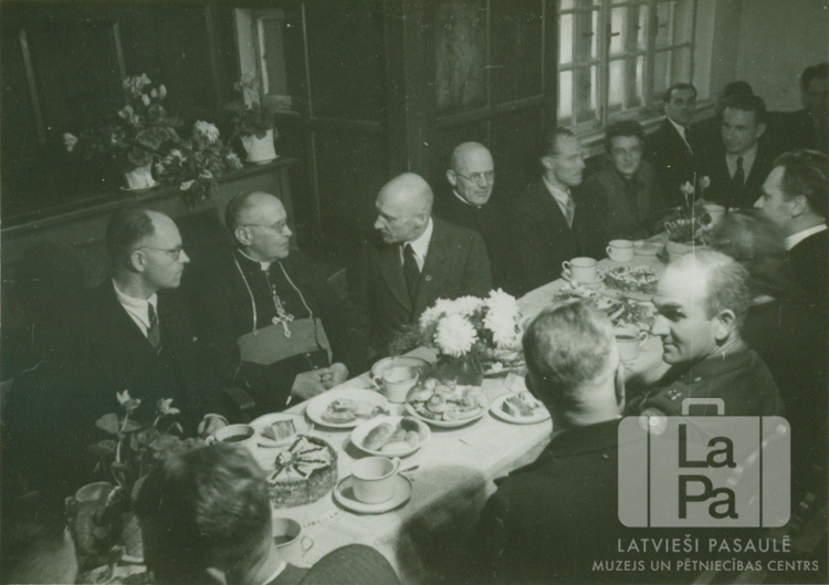 Vīri sēž pie gara galda Augsburgā (amerikāņu zonā). Uz galda ir ziedi, trauki ar kūkām un kafijas krūzes. Fonā aiz galda ir ziedi, koka paneļu interjers un logs. Skats no augšas. Galda kreisajā pusē sēž, otrais no kreisās: Rancāns (katoļu bīskaps amata tērpā). Foto autors: E. Kraucs (filma).
