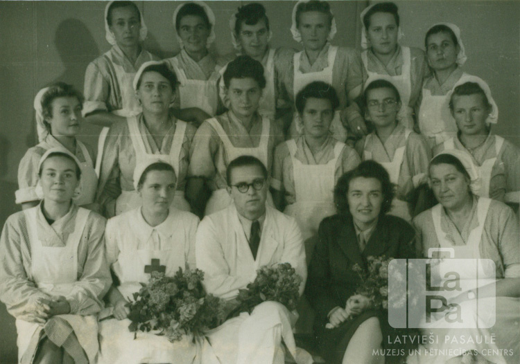 Medicīnas māsu kursu izlaidums ar kursu vadītāju pārvietoto personu slimnīcās "Servatins – Štiflā". Tajās strādāja arī sievietes no Augsburgas (amerikāņu zonā). Cilvēki trīs rindās. Lielākā daļa ir ģērbusies gaišās priekšautos un halātos, pirmajā rindā sēž sieviete tumšos svārkos un žaketē. Pirmās rindas vidū sēž vīrietis. Trim cilvēkiem pirmajā rindā klēpī ir ziedi. Pirmajā rindā, trešais no kreisās: ? Černavskis (?). Foto autors: E. Kraucs (filma).