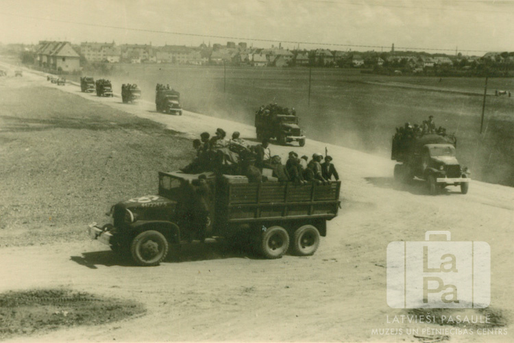 Poļu repatriantu smago automašīnu kolonna pa putekļainu ceļu dodas uz Augsburgas staciju (amerikāņu zonā). Abpus ceļam ir lauki, fonā ir pilsētas skats. Skats no augšas. Foto autors: E. Kraucs (filma).