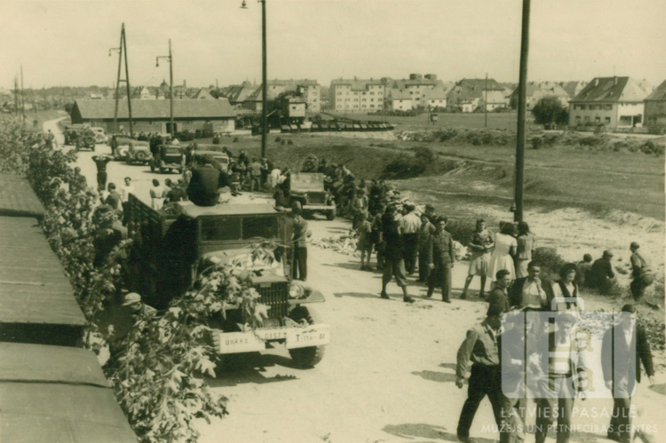 Poļu repatrianti Augsburgas stacijā (amerikāņu zonā). Cilvēki un automašīnas uz ceļa blakus ar meijām izpušķotiem vilcienu vagoniem. Fonā ir pilsētas ainava. Skats no vagona jumta. Foto autors: E. Kraucs (filma).