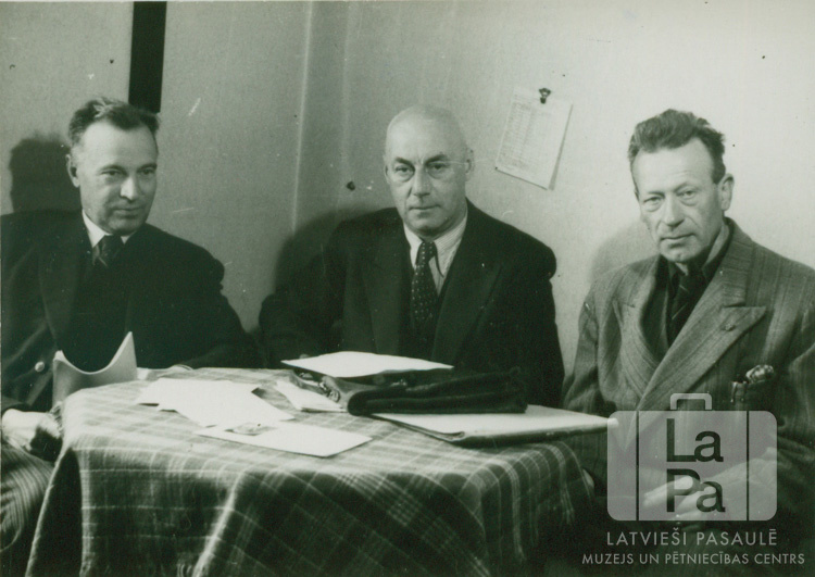Trīs vīri sēž pie galda Augsburgā (amerikāņu zonā) ciemošanās laikā pie prāvesta. Uz galda ir dokumenti un portfelis. No kreisās: A. Bļodnieks, ? Krolls (?) un ? Ķullītis (prāvests). Foto autors: E. Kraucs (filma).