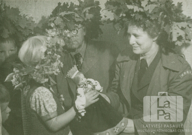 Bērns rāda lelli tautastērpā organizācijas "United Nations Relief and Rehabilitation Administration" (UNRRA) darbiniekiem bērnudārzā Augsburgā (amerikāņu zonā) 1946. gada Jāņu dienā. Kreisajā pusē stāv divi mazi zēni. UNRRAS pārstāvjiem un diviem bērniem uz galvas ir Jāņu vainagi. Foto autors: E. Kraucs (filma).