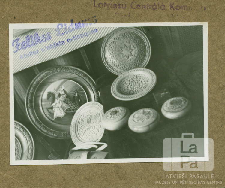 Rakstiem rotātu koka šķīvju un mazu kārbu izlase. Uz viena šķīvja ir attēlotas tautumeitas ar sirmu jātnieku zirga mugurā. Fotogrāfija ir uzlīmēta uz kartona. Uz fotogrāfijas ir divi zīmogi. Uz viena ir rakstīts: "Felikss Lidums / Atelier d objets artistiques"; uz otra ir rakstīts: "Latviešu Centrālā Komiteja".