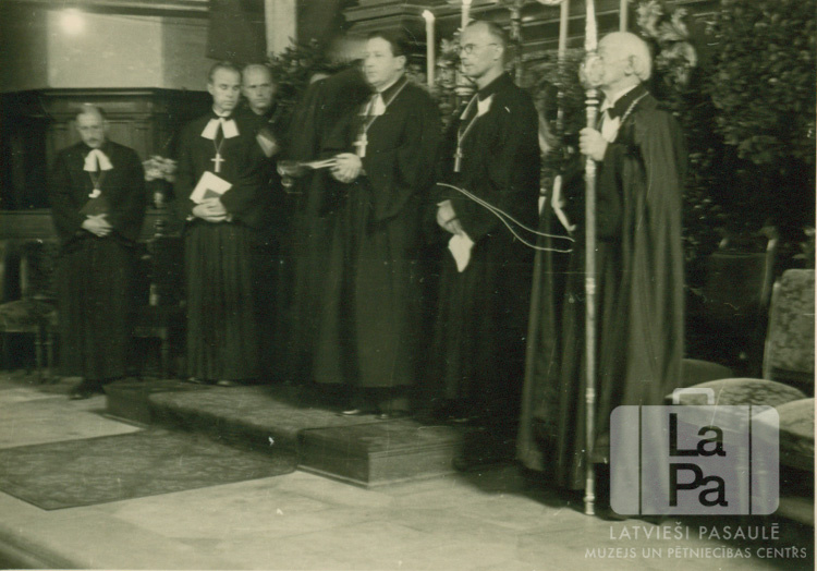 Mācītāji un arhibīskaps amata tērpos stāv rindā viens otram blakus baznīcas altāra priekšā arhibīskapa jubilejas svinību laikā. Aiz mācītājiem stāv citi vīrieši. Priekšā, pirmais no labās: Teodors Grīnbergs (arhibīskaps, ar scepteri rokā).