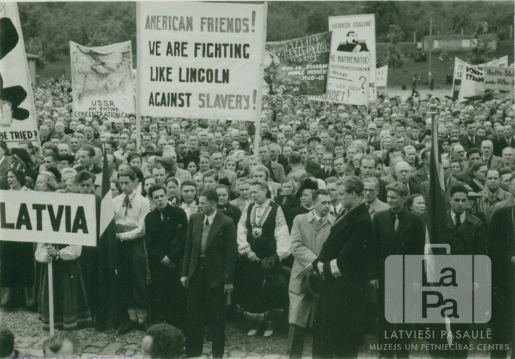 Liela demonstrantu grupa ar plakātiem Cufenhauzenē (amerikāņu zonā). Cilvēki stāv tautastērpos un mēteļos. Uz plakātiem ir dažādi uzraksti, piemēram, "LATVIA", "AMERICAN FRIENDS! / WE ARE FIGHTING / LIKE LINCOLN / AGAINST SLAVERY!". Priekšā labajā pusē stāv vīrietis ar Latvijas karogu. Fonā ir neliela nogāze un mežs.