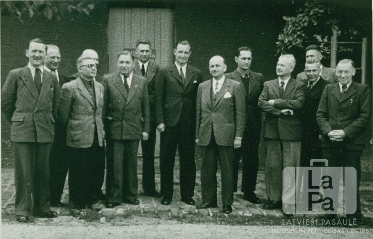 Latvijas Centrālās komitejas vīru grupa Nirnbergā (amerikāņu zonā). Vīri uzvalkos stāv trīs rindās ēkas priekšā. Pirmajā rindā stāv, no kreisās: ceturtais Harolds Klarks (Centrālās nometnes Vircburgā komandants) un piektais ? Gallāns (Latvian Relief vicap.). Foto autors: K. Puriņš (Valkas nometne Nirnbergā).